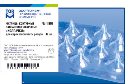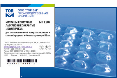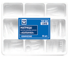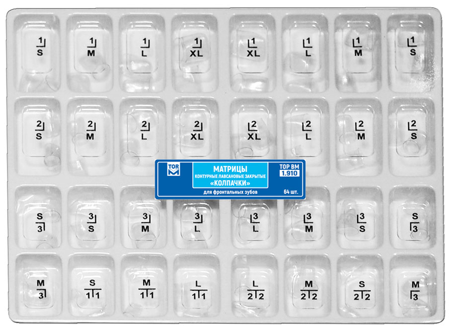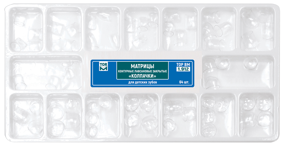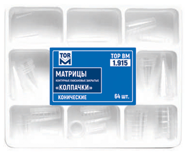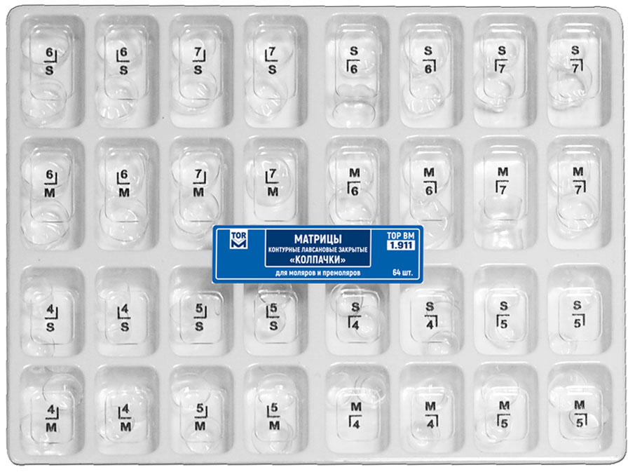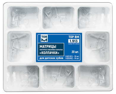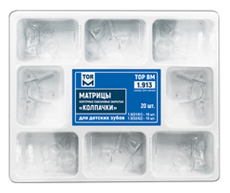 Выпускаются матрицы-«колпачки» для передних зубов № 1.910, для моляров и премоляров № 1.911, для детских зубов № 1.912 и № 1.913, матрицы-«колпачки» конические № 1.915 , а также ассорти матриц-«колпачков» на пластинах №№ 1.901, 1.903, 1.905, 1.907, 1.908, 1.909 .