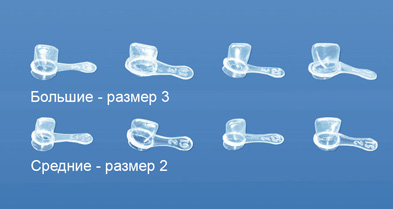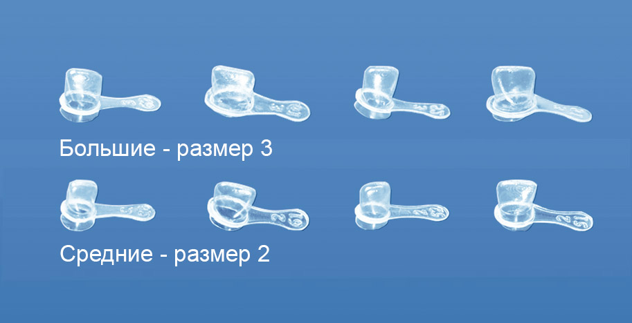 Матрицы-«колпачки» выпускаются в двух размерах – среднем (размер 2) и большом (размер 3). Каждая матрица (колпачок) имеет держатель, что делает работу с ней более удобной. На держателе указаны номер зуба и размер колпачка.