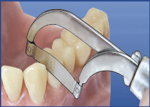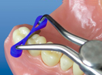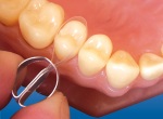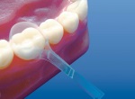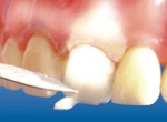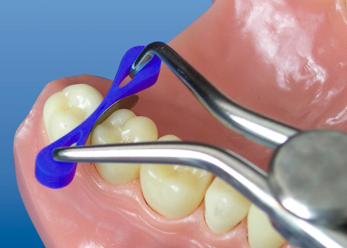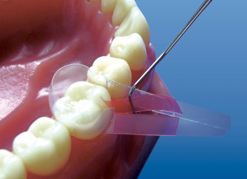 | Remove excess filling material by rocking motion of the blade (strip) 4 within inter-proximal space. |