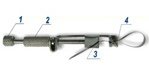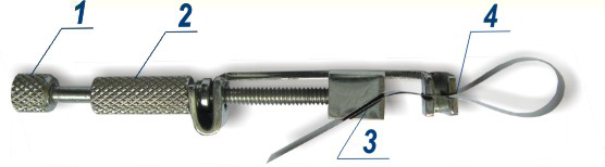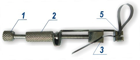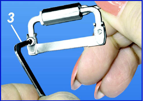 | Rotate screw handle 3 of the holder to tighten up the blade (strip) between legs 1 and 2 of the holder. | |