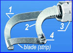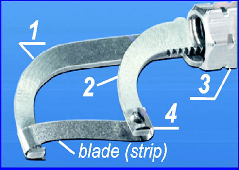 | Rotate screw handle 1 to tighten the blade (strip) between holder legs. | |