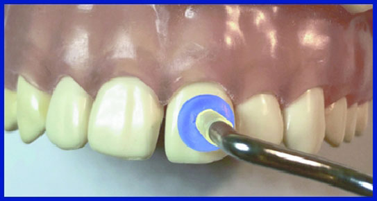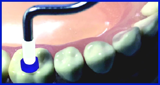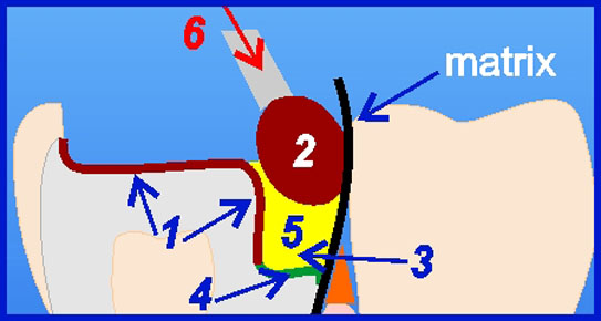 2) Apply a layer 1 of 0,3-0,5 mm of flowable composite on the prepared surface excluding gingival area and perform photopolymerization 3) Prepare globule 2 from universal composite a bit smaller in size than contact area cavity (area 3) and perform its photopolymerization 4) Apply a thin layer 4 of flowable composite on gingival area – DO NOT PERFORM PHOTOPOLYMERIZATION! 5) Fill contact area cavity 3 with universal composite 5 approximately up to the contact point – DO NOT PERFORM PHOTOPOLYMERIZATION! 6) Place globule 2 into the cavity 3 and using contact former 6 press the globule towards matrix and the neighbor tooth 7) Perform photopolymerization in 2 stages: 1 - the globule 2 being pressed by contact former 6, 2 – contact former 6 being removed from the mouth 8) Restore grinding surface of the tooth 9) Force matrix from the side slopes of the tooth and preform photopolymerization once more directing light on gingival area from the side of facial and lingual surfaces 10) Remove matrix and wedge 11) Finish the restoration 12) Check contact the state of contact surfaces and contact point location and density with floss |