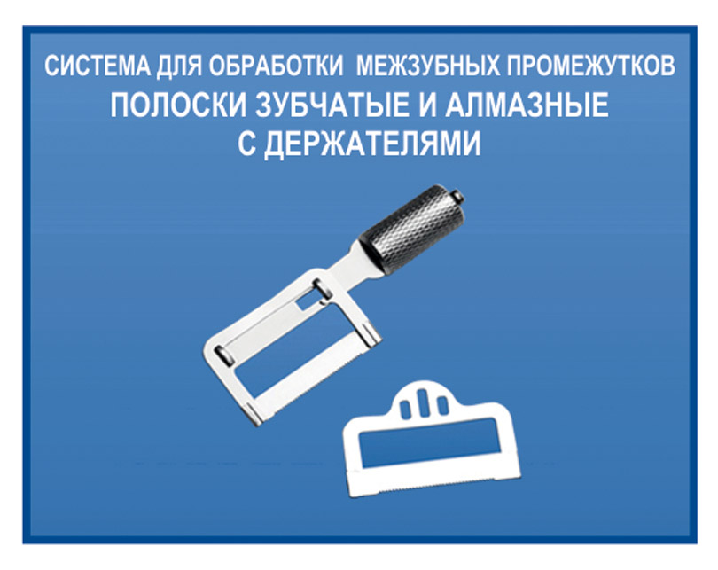 Система для обработки межзубных промежутков Полоски зубчатые и алмазные с держателями Система предназначена для удаления излишков пломбировочного материала из межзубных областей и разделения зубов при фиксации виниров.