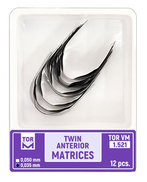 both interproximal and cervical surfaces of anteriors. Twin anterior matrices are available in two thicknesses - 0.050 mm and 0.035 mm. |